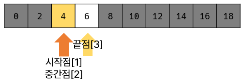 - 중간점이 실수일 때는 소수점 이하를 버린다. ➡️ `시작점`: 0, `끝점`: 9, `중간점`: 4