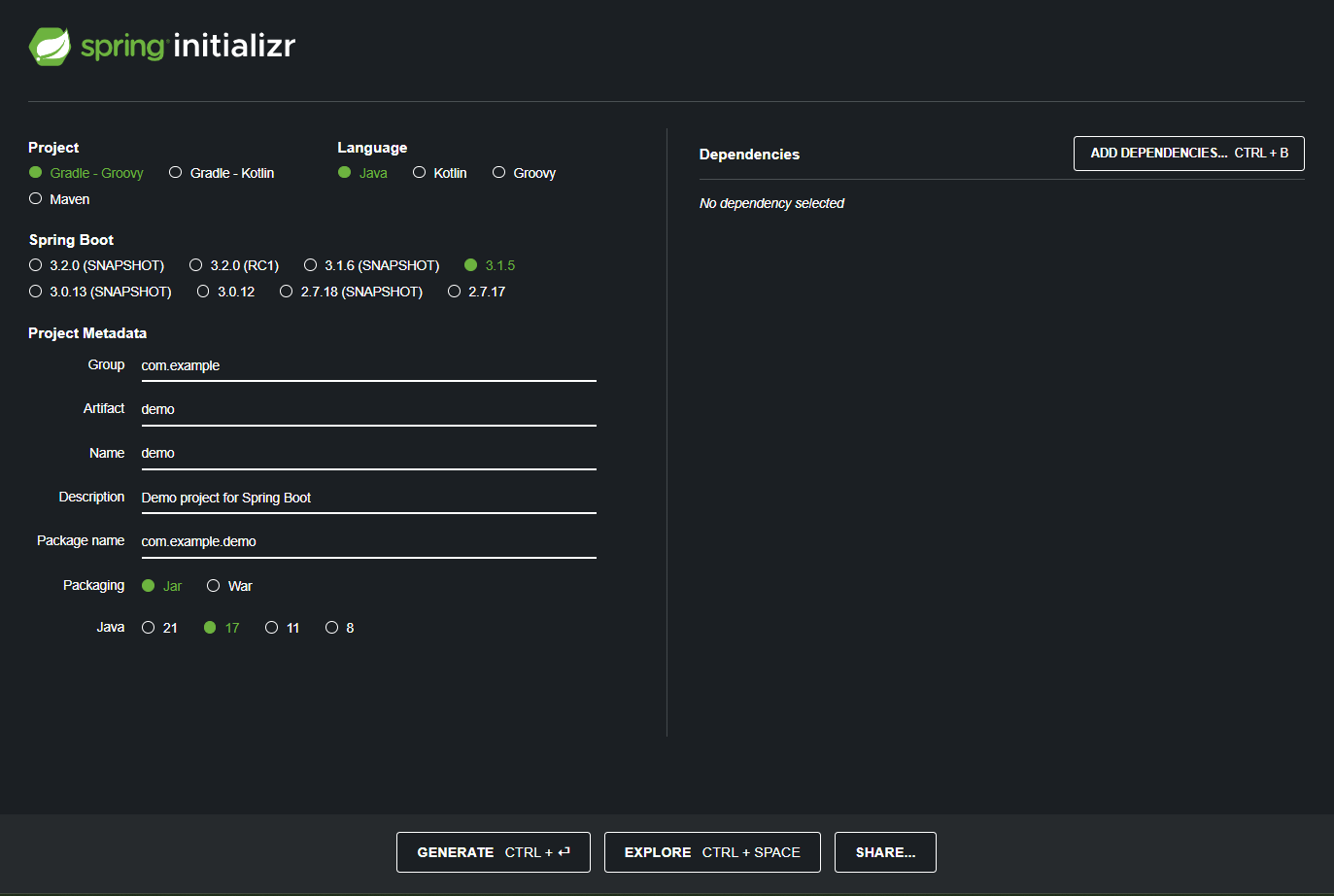 Spring Boot 애플리케이션을 빠르게 생성하고 구성할 수 있는 웹 기반 서비스이다.