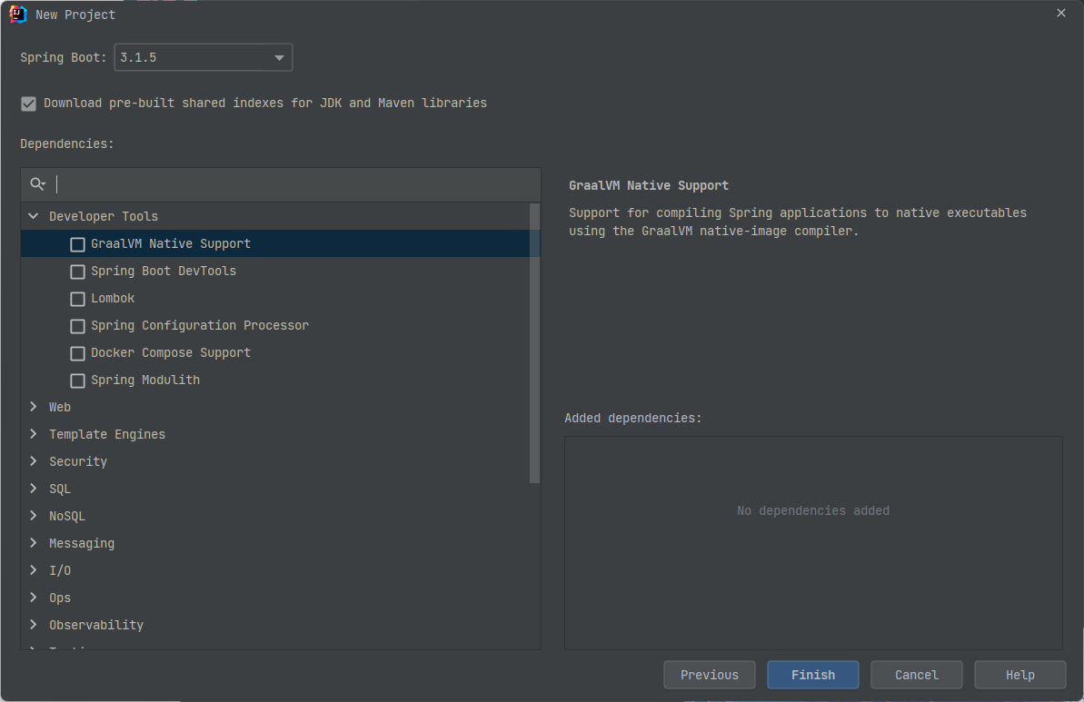 - `ADD DEPENDENCIES`를 클릭하여 필요한 의존성 라이브러리를 추가할 수 있다.