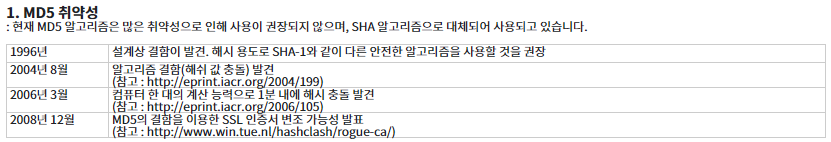 - 주로 데이터 무결성 검증을 위해 사용되지만, 현재는 보안성에 취약하므로 사용을 권장하지 않는다.