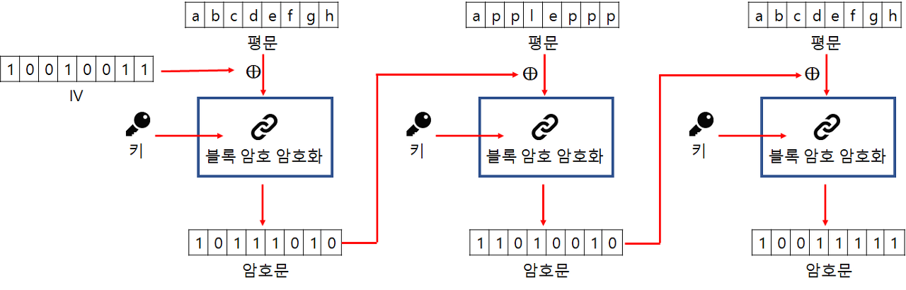 - `IV(Initialization vector)`를 사용하여 각 블록을 암호화하기 전에 이전 암호문 블록과 XOR 연산한다.