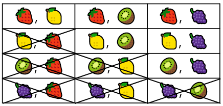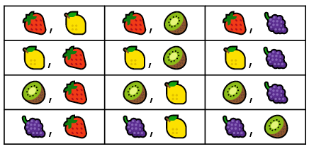 순열과 조합의 차이를 이해하기 위해 서로 다른 과일 4개가 있다고 가정해보자. (🍓, 🍋, 🥝, 🍇)