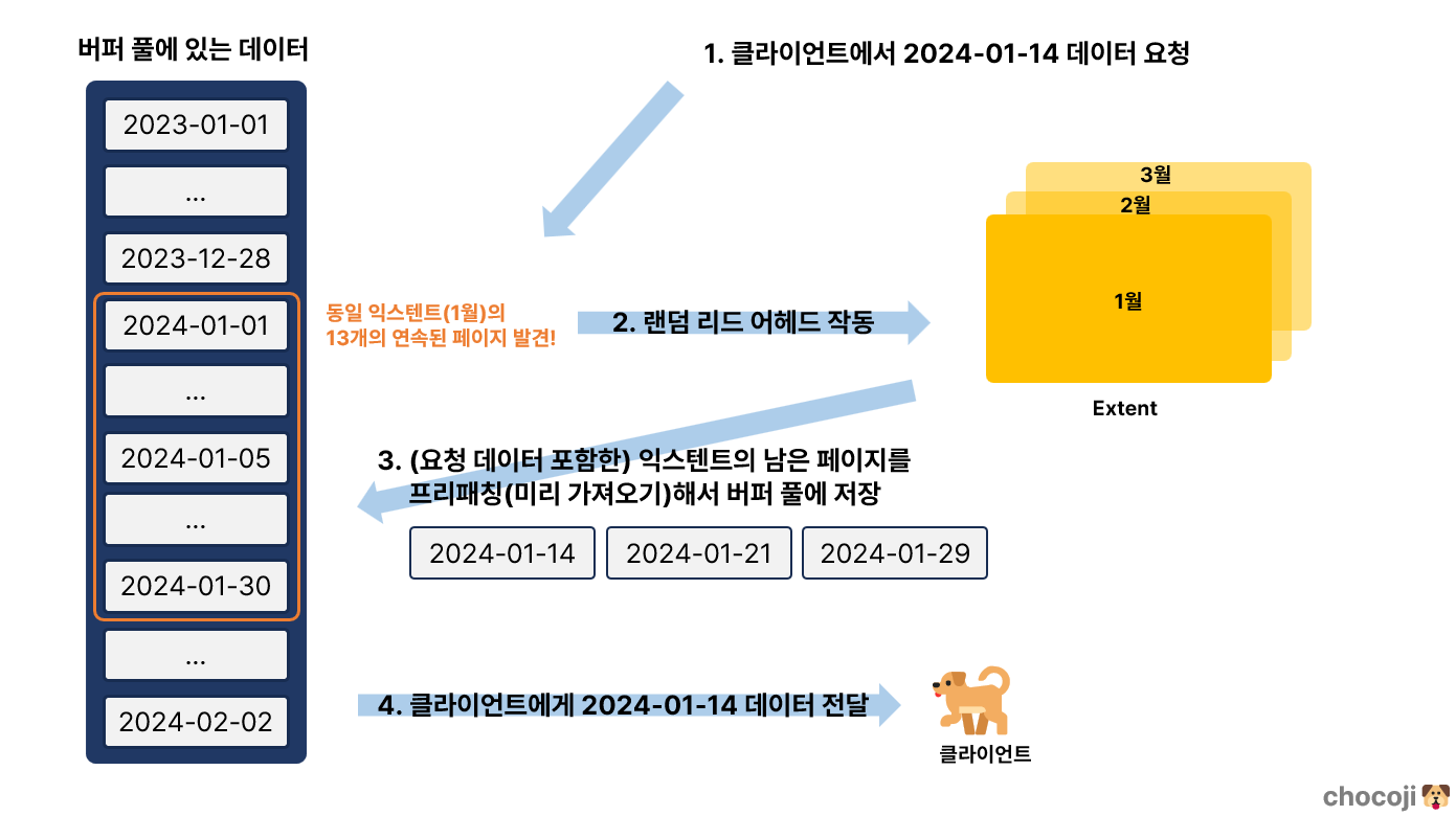 `리드 어헤드(read-ahead) 요청`은 버퍼 풀에서 해당 페이지에 대한 수요가 임박할 것을 예측하여 비동기적으로 프리페치하는(미리 가져오는) I/O 요청이다. 이 요청은 하나의 `익스텐트(extent)`에 해당하는 모든 페이지를 가져온다.