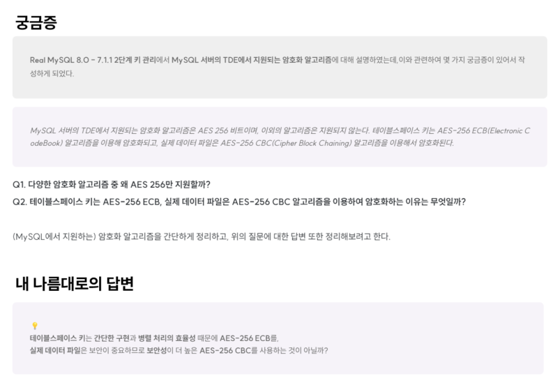스터디를 하기 전에는 인덱스가 어떻게 동작하는지, 리드 어헤드는 무엇인지 등 모르는 용어도 많고 정보처리기사 자격증 취득을 위해 단순 암기만 했었다. InnoDB 버퍼 풀, 인덱스, 옵티마이저 등 MySQL 동작과 관련된 핵심 개념들을 공부하면서 전반적인 흐름을 이해할 수 있었다. 이렇게 전체 흐름을 이해하고 추가적인 개념을 학습하니까 전보다 더욱 이해하기 쉽고 머릿속에 잘 들어오는 것 같았다.