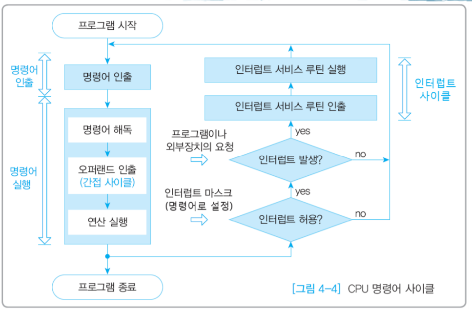 - 즉, 프로그램 속 각각의 명령어는 `인출`, `간접`, `실행`, `인터럽트` 사이클이 반복되며 실행된다.