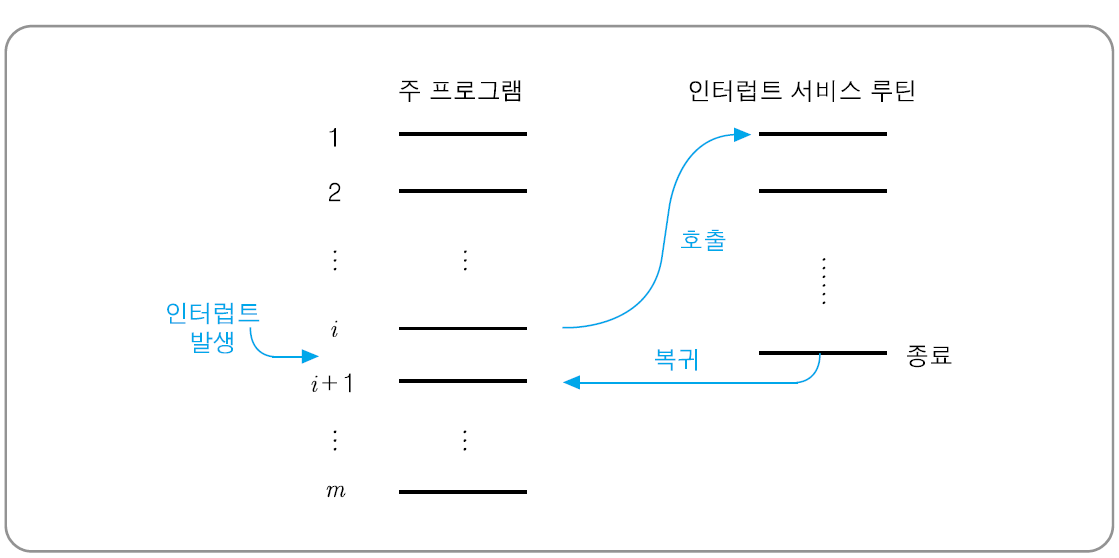 - 인터럽트를 처리하는 방법은 입출력 장치마다 다르므로 각기 다른 서비스 루틴을 가지고 있다.