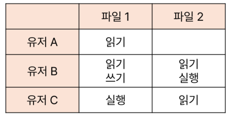 - 접근 제어 행렬(Access Control Matrix): 전체 주체와 전체 객체에 대한 권한 관계를 2차원 배열로 관리하는 방법