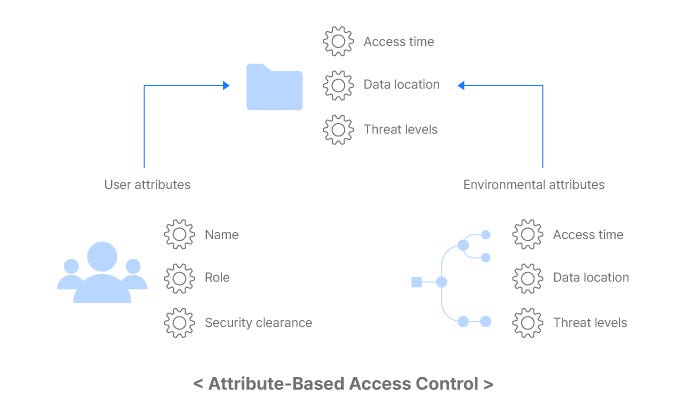Attribute Based Access Control. 사용자, 리소스, 환경 등의 속성에 따라 접근 권한을 결정하는 방식