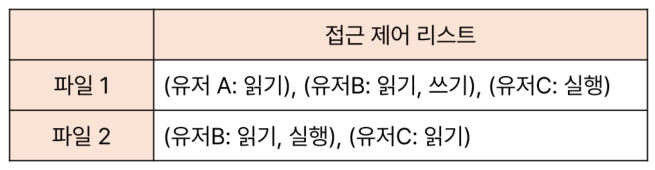 - 접근 제어 목록(Access Control List, ACL): 각 객체에 대해 권한을 가지고 있는 주체를 리스트 형태로 관리하는 방법