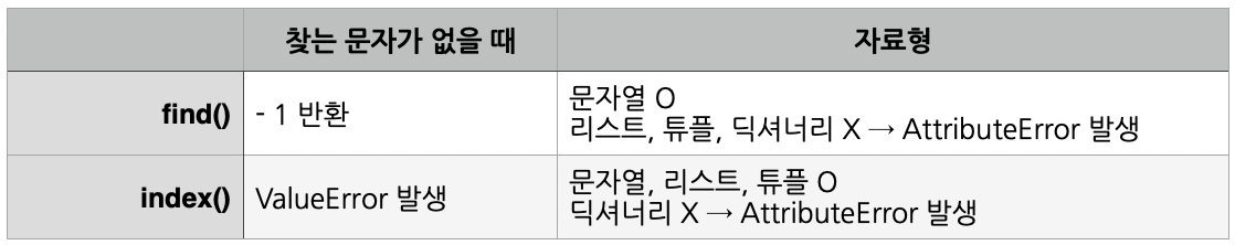 - 추가적으로 찾고 싶은 문자가 여러 개일 때 마지막 인덱스를 반환해주고 싶을 경우 rfind()를 사용하면 된다.