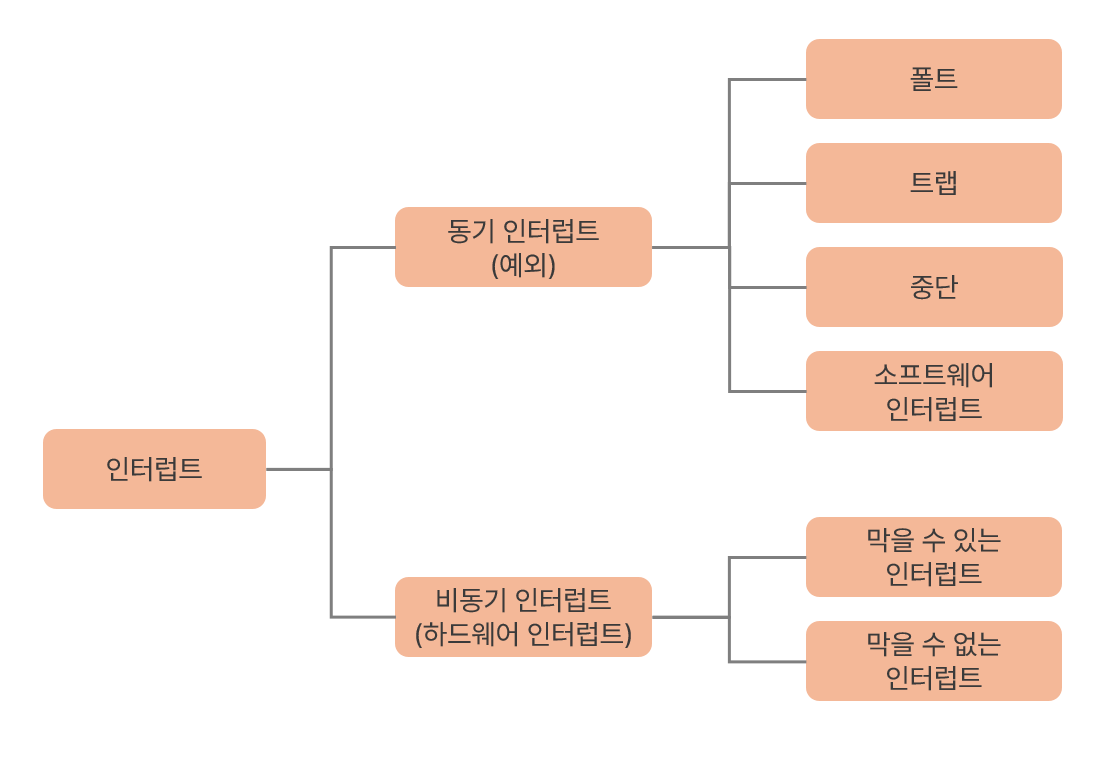 - 인터럽트는 키보드, 마우스 등 I/O 디바이스로 인한 인터럽트, 0으로 숫자를 나누는 산술 연산에서의 인터럽트, 프로세스 오류 등으로 발생한다.