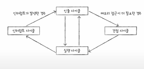 - 즉, 프로그램 속 각각의 명령어는 `인출`, `간접`, `실행`, `인터럽트` 사이클이 반복되며 실행된다.